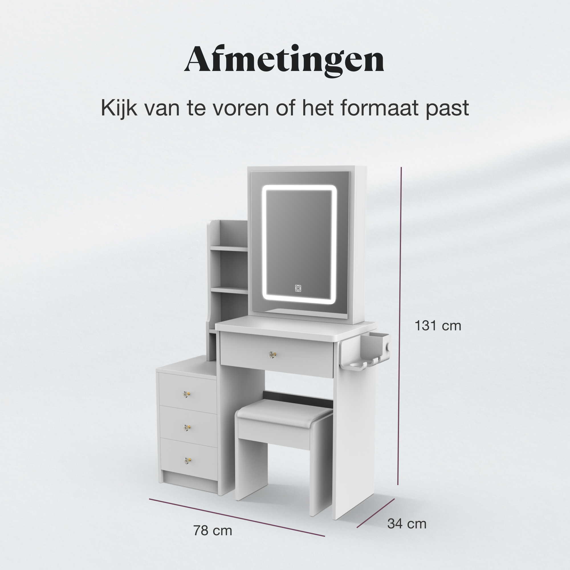 De kaptafel is 78 cm breed, 34 cm diep en 131 cm hoog.